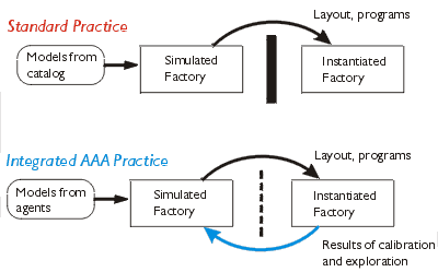 AAA enables this iterative approach by lowering the barriers between simulation and reality. A user can load specifications of agent behavior from agents themselves into the development environment, thus maximizing the chance of getting faithful simulations .The user can then construct and program virtual factories that perform their tasks. When the factory is assembled, the interface tool can monitor the agents' exploration of their environment, adjusting the virtual representation to precisely match the physical factory. As the physical factory runs, the integrated interface tool monitors its operation and provides a 3D rendering of the working factory.
